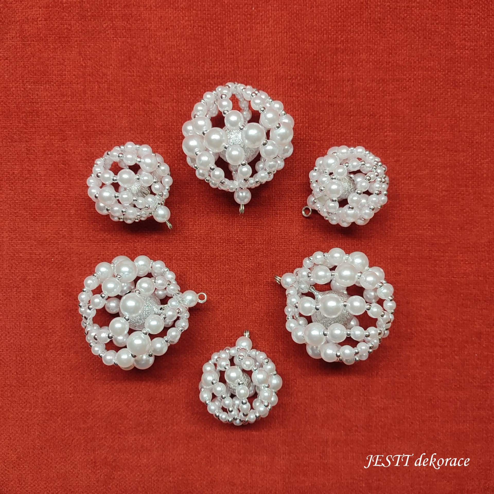 Ručně šitá korálková ozdoba s rolničkou vel. 4 a 6 cm. Materiál plast v kombinaci s komponenty z běžných kovů.