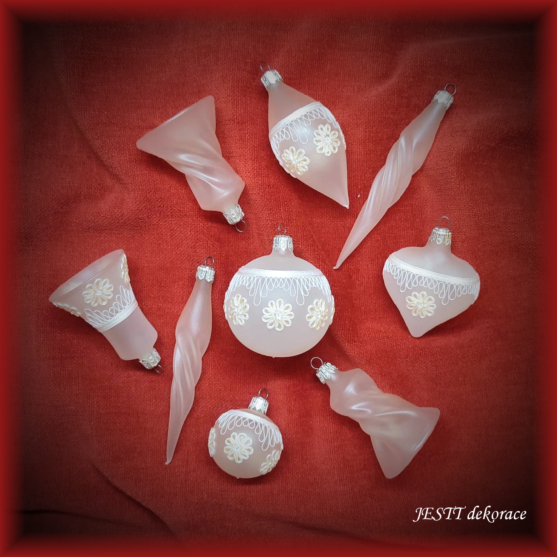 Sada 9 ks skleněných ozdob ve velikosti 4 - 6 cm zdobených nalepenou bavlnkou. Ozdoby jsou na povrchu sametově matné, přesto průhledné.